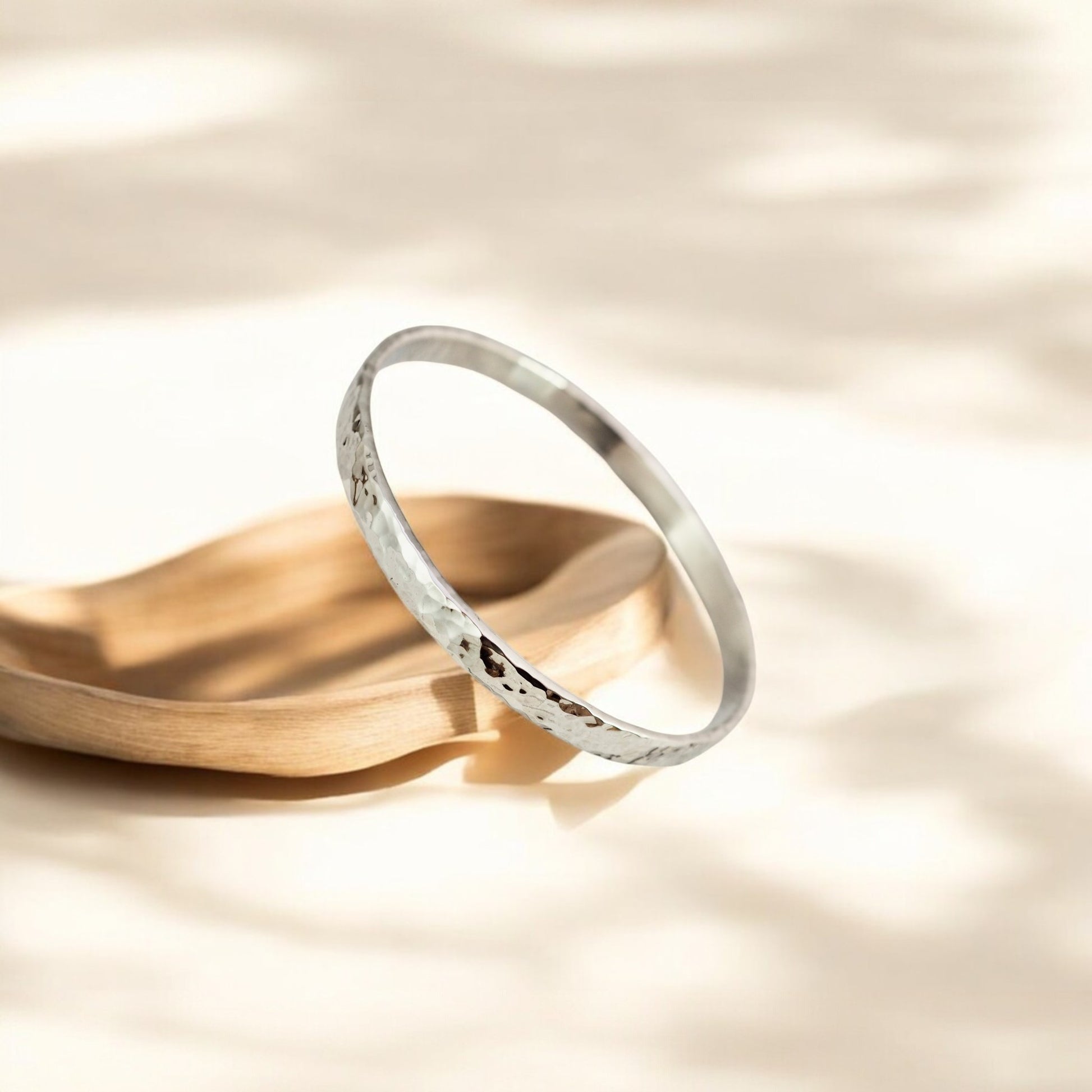 Nuestra pulsera martillada en Plata 925 combina un diseño minimalista con un acabado artesanal que resalta su textura única. Su estilo versátil la convierte en un accesorio atemporal, ideal para quienes buscan una joya con personalidad y un toque de originalidad.