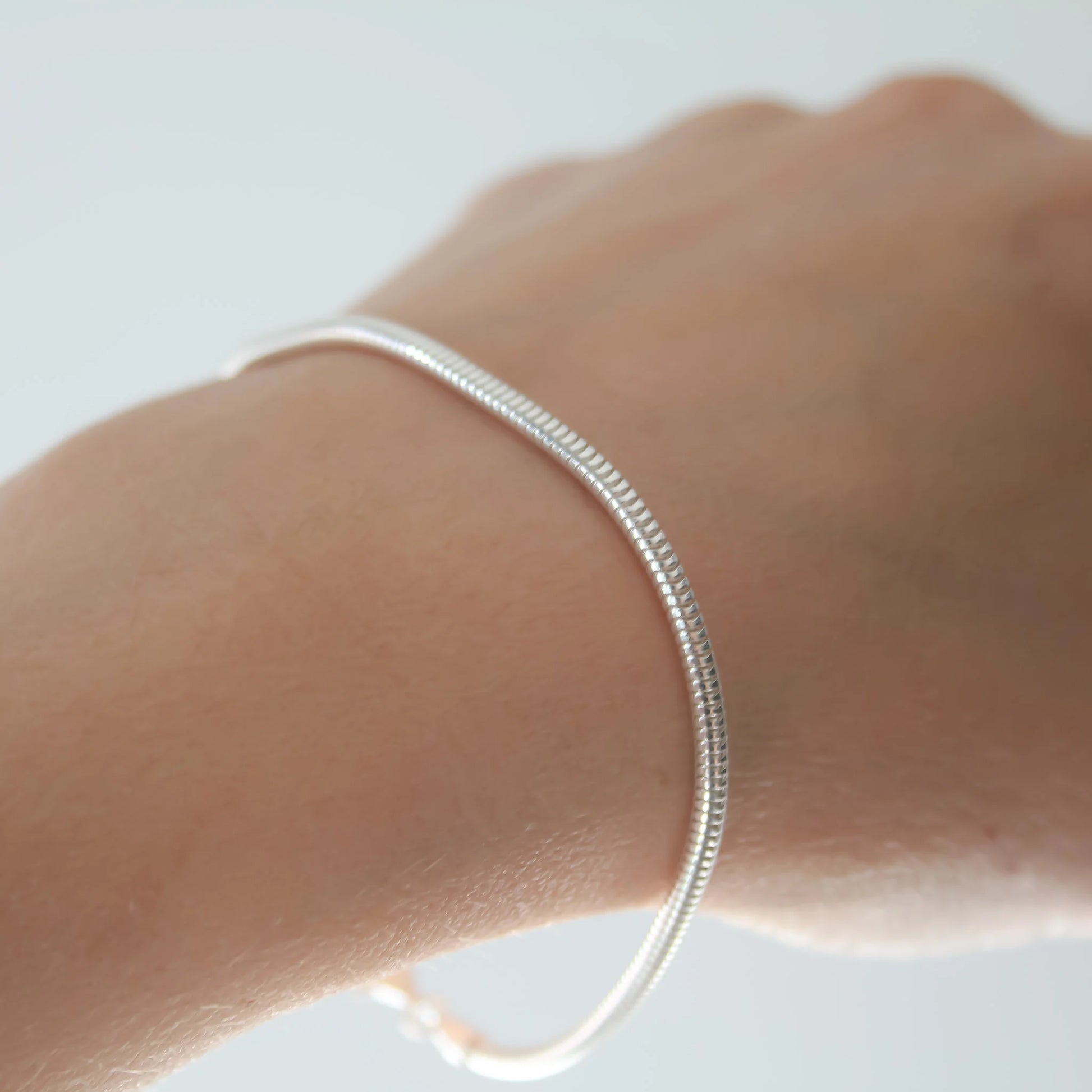Elegante y fluida, nuestra pulsera Snake en Plata 925 se distingue por su diseño continuo y suave, inspirado en el movimiento de una serpiente. Su estructura flexible y pulida refleja la luz con un brillo sutil, creando un acabado sofisticado y moderno. Perfecta para lucir sola o con un dije conmemorativo.